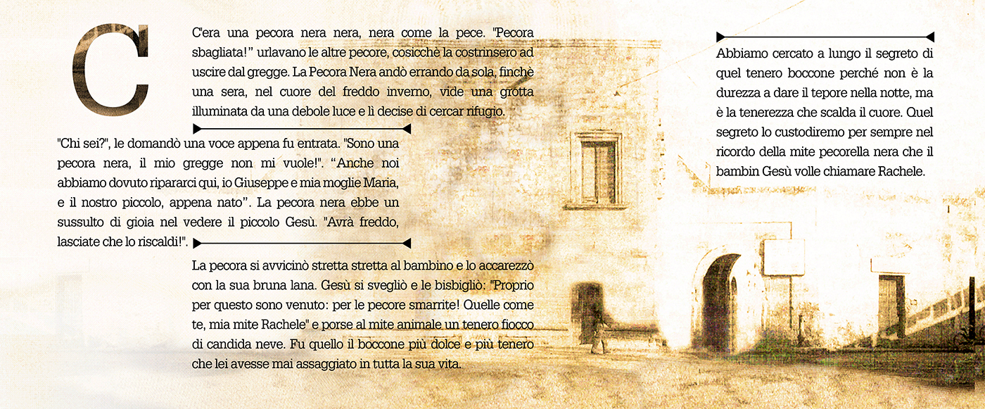 "Chi sei?", le domandò una voce appena fu entrata. "Sono una pecora nera, il mio gregge non mi vuole!". “Anche noi abbiamo dovuto ripararci qui, io Giuseppe e mia moglie Maria, e il nostro piccolo, appena nato”. La pecora nera ebbe un sussulto di gioia nel vedere il piccolo Gesù. "Avrà freddo, lasciate che lo riscaldi!".