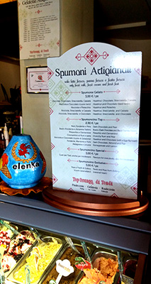 Tra gli Spumoni, provenienti dall'esperienza di 50 anni della suocera Ada, arricchita dall'estro di Paolo Tondi, offriamo: il Boero, fatto di cioccolato e amarena, il Nero fondente e pere, il Pistacchio e clementine, il Fave e piselli, e lo spumone più naturale che c'è, fatto di frutta fresca frullata.